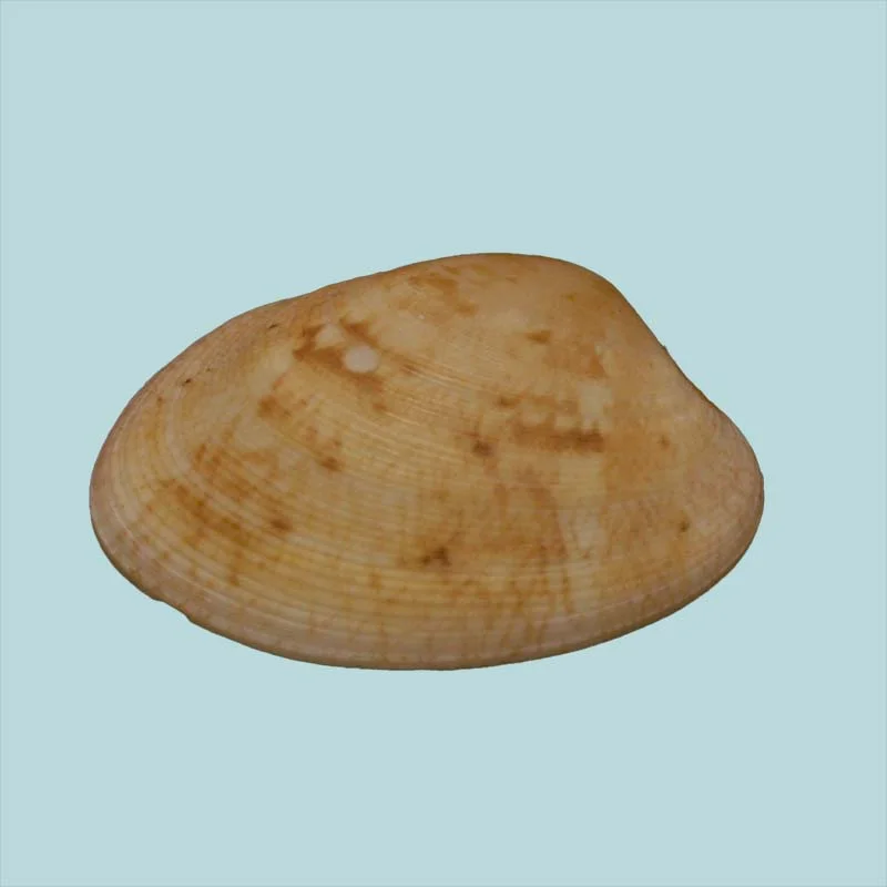 Smooth, glossy clam with cream to light brown shell, collected by trawling at depths of 40–50 meters. Edible and decorative.