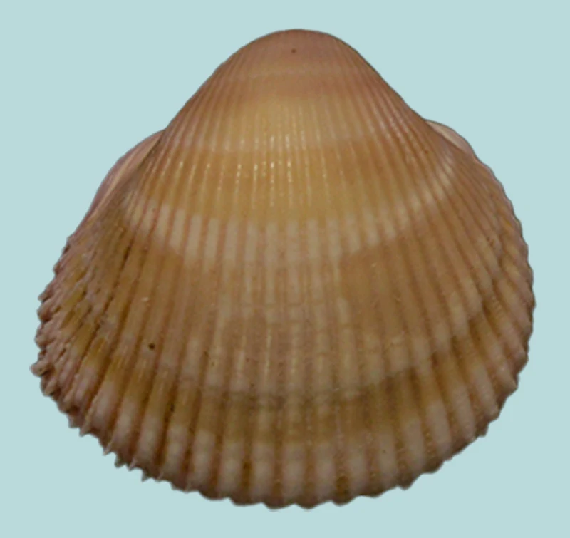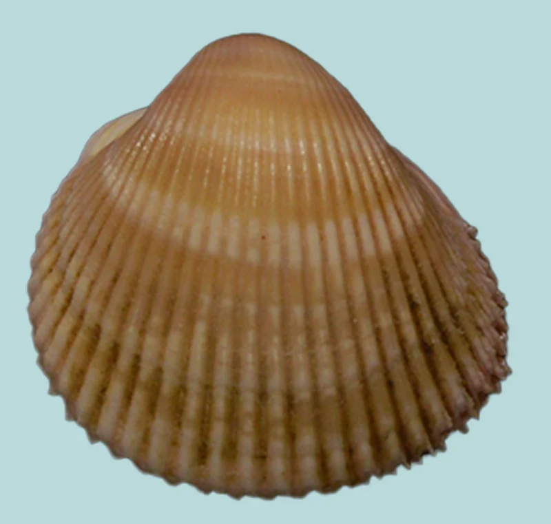 Vepricardium asiaticum, a marine bivalve belonging to the family Cardiidae. Size ( 23.14 mm ) The shells are heart-shaped with strong, evenly spaced radial ribs and a smooth, rounded top. Their color ranges from light beige to creamy brown, often with faint white bands across the surface.